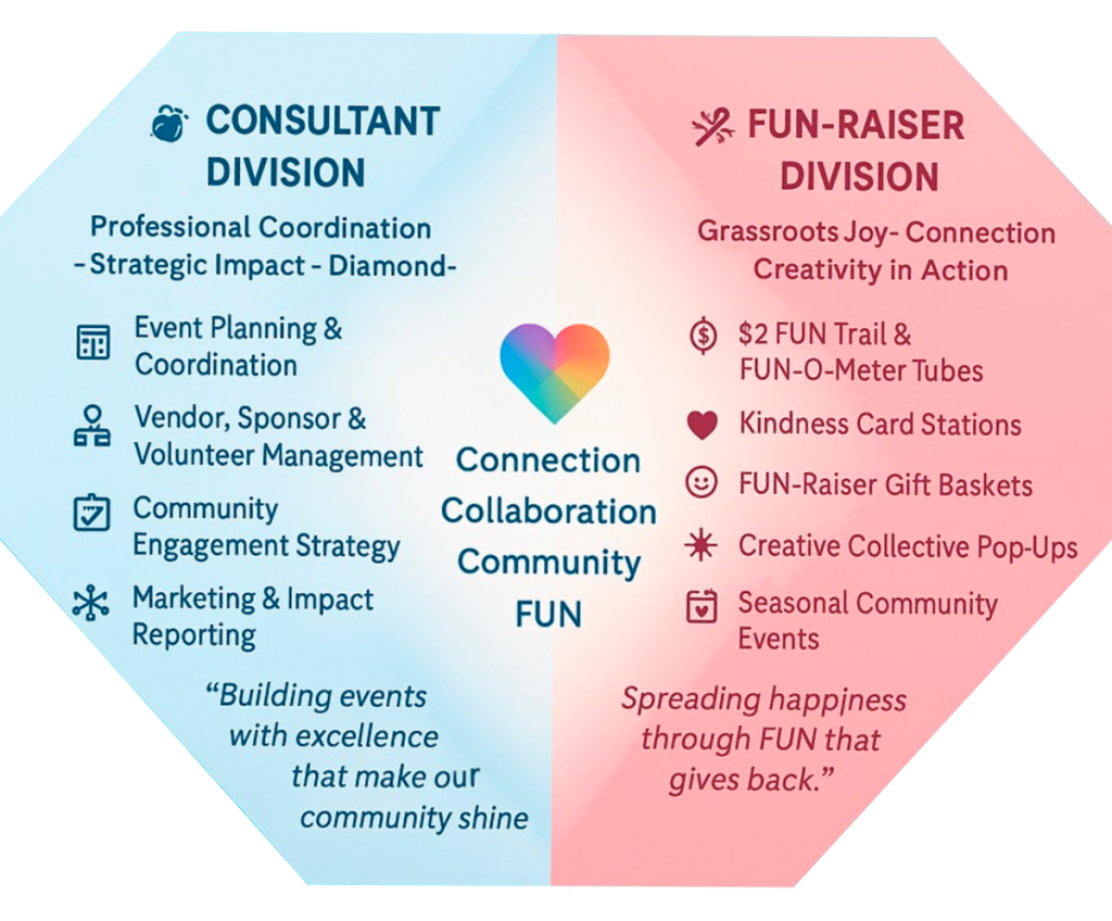 This side channels that same professional strength into joy-filled fundraising experiences $2 FUN Trails, community games, and locally curated gift baskets that support nonprofits while boosting small business revenue.